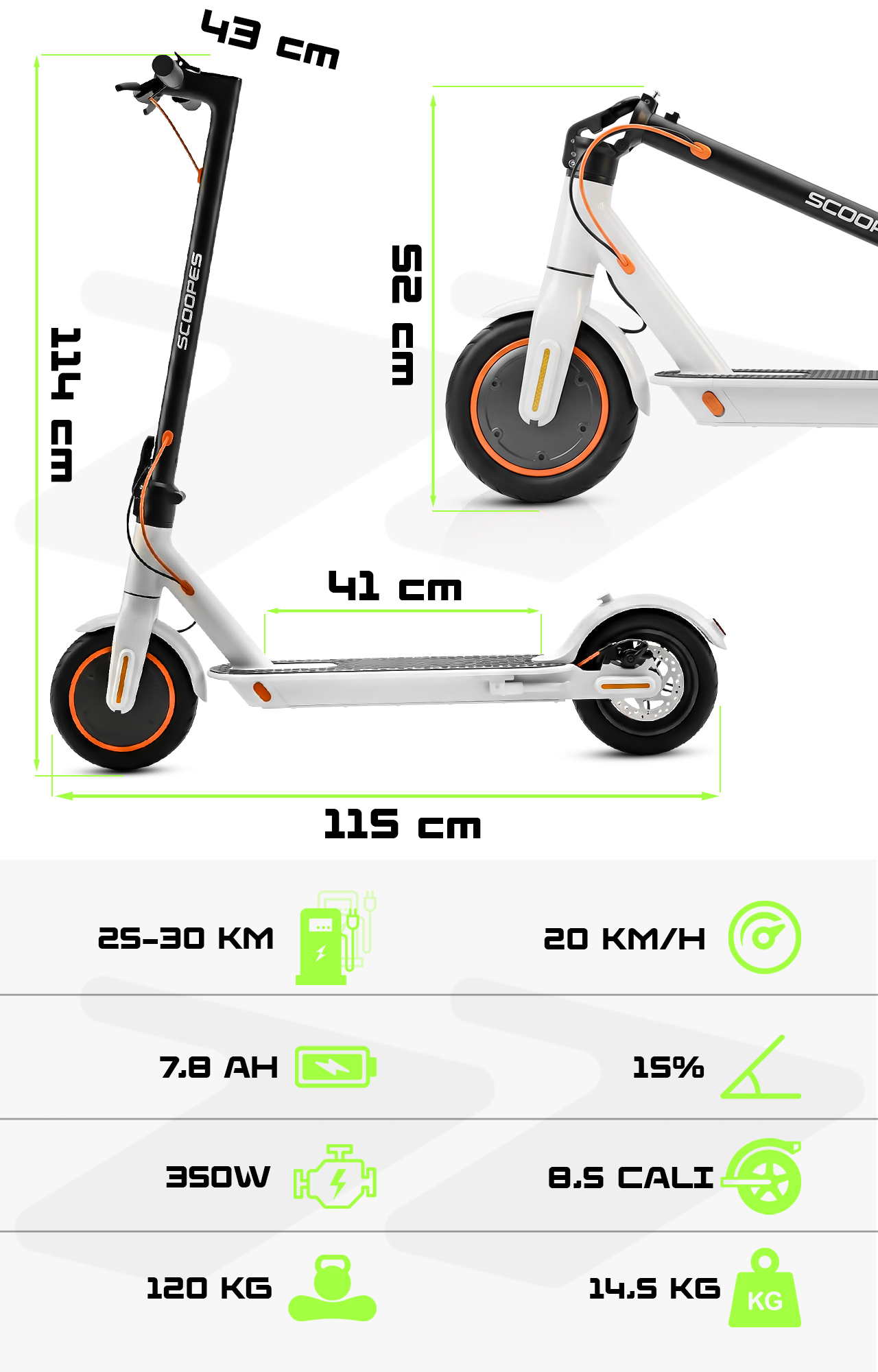Opony: 8.5-calowe pneumatyczne, pompowane